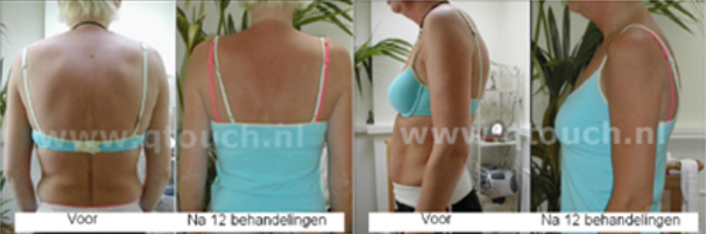 De eerste keer was al gelijk heel bijzonder. Er zat ook een soort bobbel achter op haar nek en die was in 1x verdwenen. Ze kon het niet geloven, ik trouwens ook niet. We kregen de smaak te pakken. Elke keer dat ze kwam werd haar rug een stukje rechter. Ze vertelde ook dat ze het gevoel had dat ze meer lucht kreeg. Dat klopte ook, omdat ze steeds rechter op kwam, kregen haar longen meer ruimte. De foto’s zijn het resultaat van 12x behandelen. Het was ook zeer emotioneel voor haar. Ze had nooit meer gedacht dat er nog iets aan haar rug zou kunnen gedaan worden. Ze vertelde ook dat ze andere truitjes moest kopen omdat ze er niet meer met haar schouders inpaste. Ze is van een S naar een M gegaan.