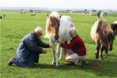aard. Er was geen respons van haar , en leek alsof je in een stuk ossehaas duwde. Het voelde koud en afschuwelijk. Allevier haar benen waren hard en stijf en haar hoeven stonden in brand, zo heet waren ze. De eerste keer behandelden we haar voor meer dan een uur, van boven naar beneden, stukje voor stukje tot leven brengend. Na de behandeling, die ze heerlijk vond (ze sliep) liep ze langzaam naar de sloot om te gaan drinken.